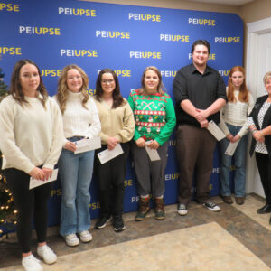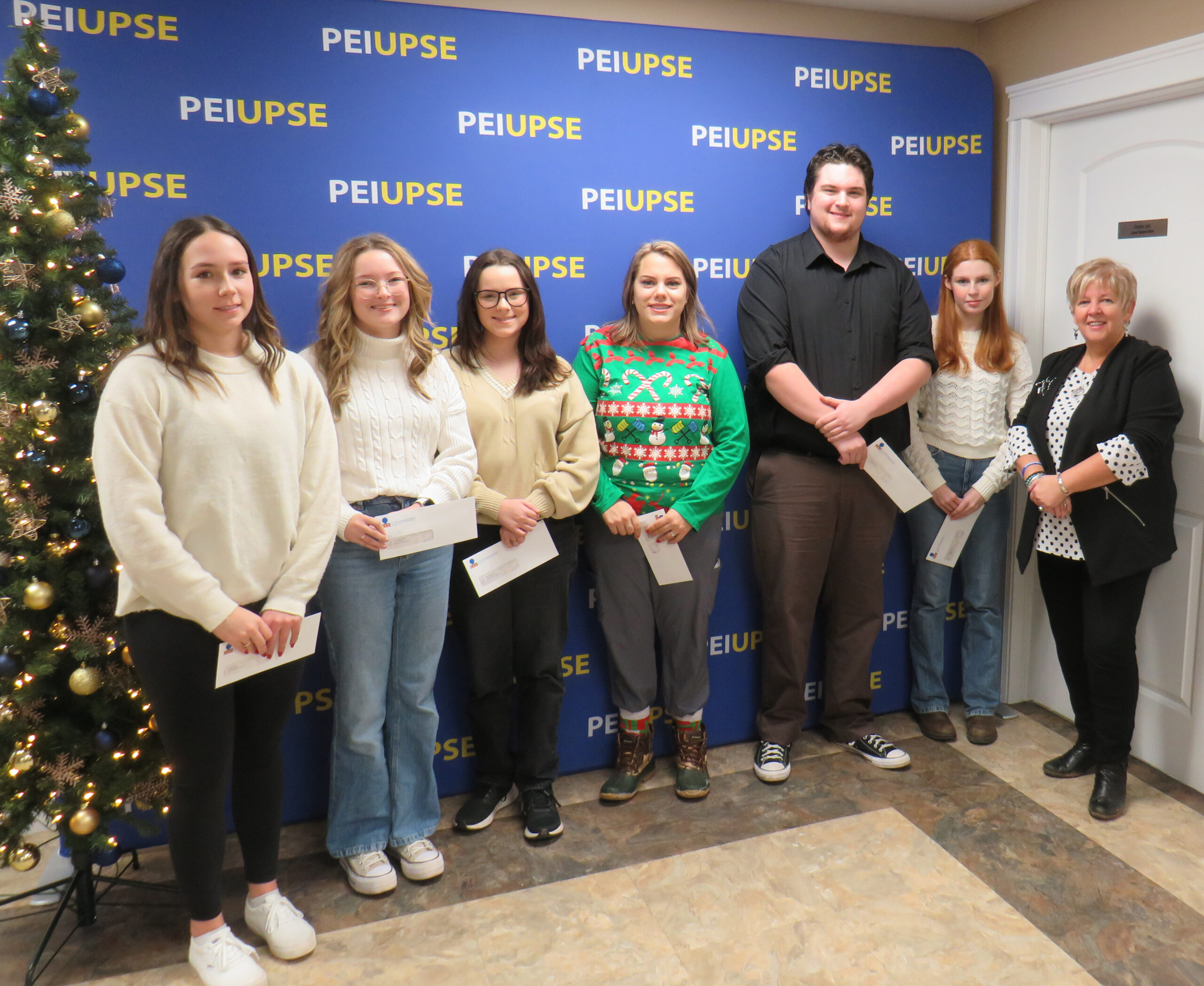 Group photo (L-R): Emily Pater ($500), Emma Marchbank ($500), Katie Marchbank ($500), Charlotte Dirani (Julie MacKay Bursary, $500), William MacKinley (Learning Scholarship, $1,000), Jennifer Arsenault ($500), and Karen Jackson (UPSE President).